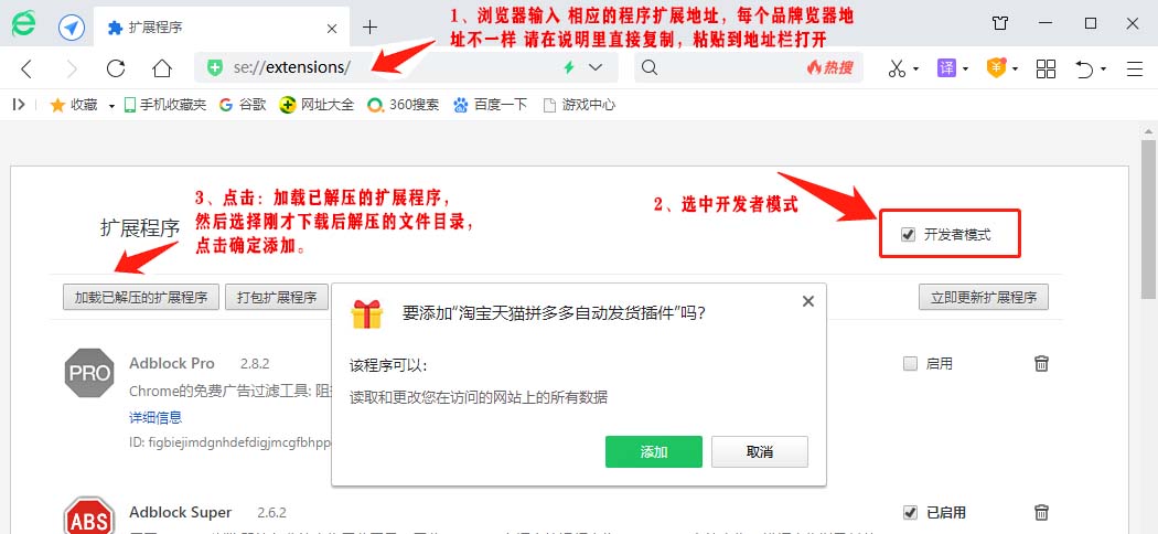 (1)打开360浏览器,然后在地址栏输入se://extensions/ 进入扩展程序列表。